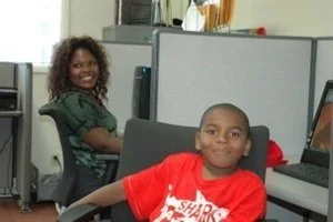 Two children, a girl and a boy, smiling in an office setting with cubicles and computers.