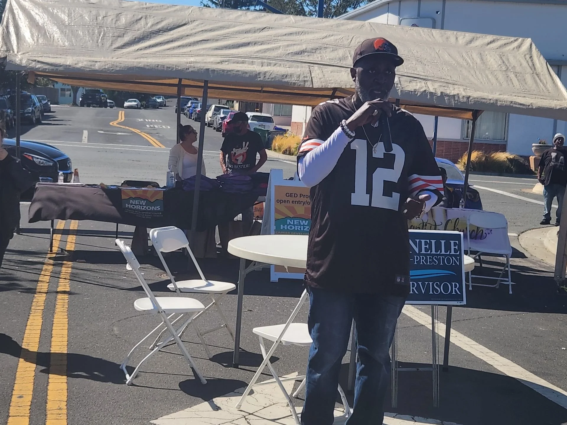 A man speaking into a microphone at an outdoor event booth on a city street. The booth has a sign with political candidate's name, 'Valerie Preston,' and there is a table with folding chairs around it. Several people are in the background, some weari
