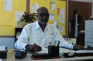Man with gray hair and beard wearing white shirt sitting at a desk in an office.